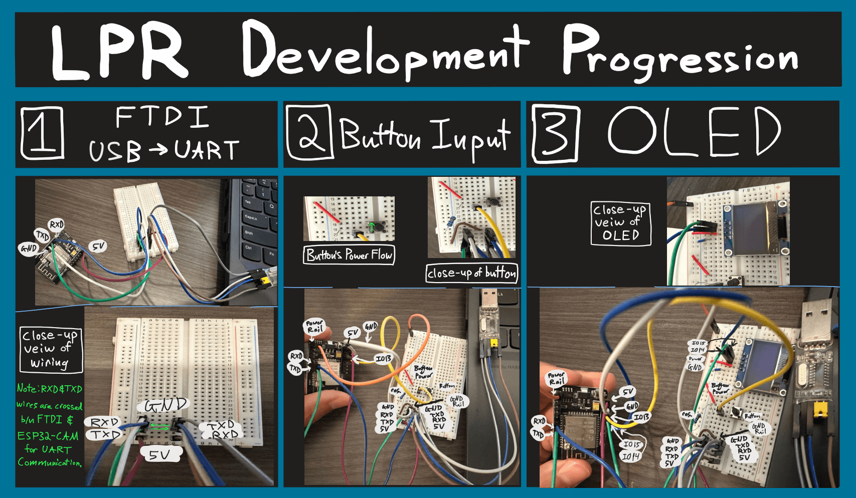 This project involved designing an embedded computer-vision system using a ESP32-CAM to capture vehicle images and perform license plate recognition (LPR). The system uses a button to trigger image capture. Once clicked, the image is processed and the identified text appear on the OLED display. This step leverages cloud based image processing to extract then return recognized license plate text. The final results are displayed both on the OLED screen and as an annotated image returned from remote processing.